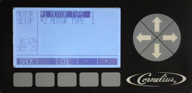 The Viper has two motor types to select from, 50hz or 60hz and is set at the factory based on the model unit built. From the maintenance menu, select MOTOR SETUP using the up and down arrows, highlight the desired motor. Press the + or – buttons to set the correct motor type. Motor type 1 is for 60hz and motor type 2 is for 50hz units.